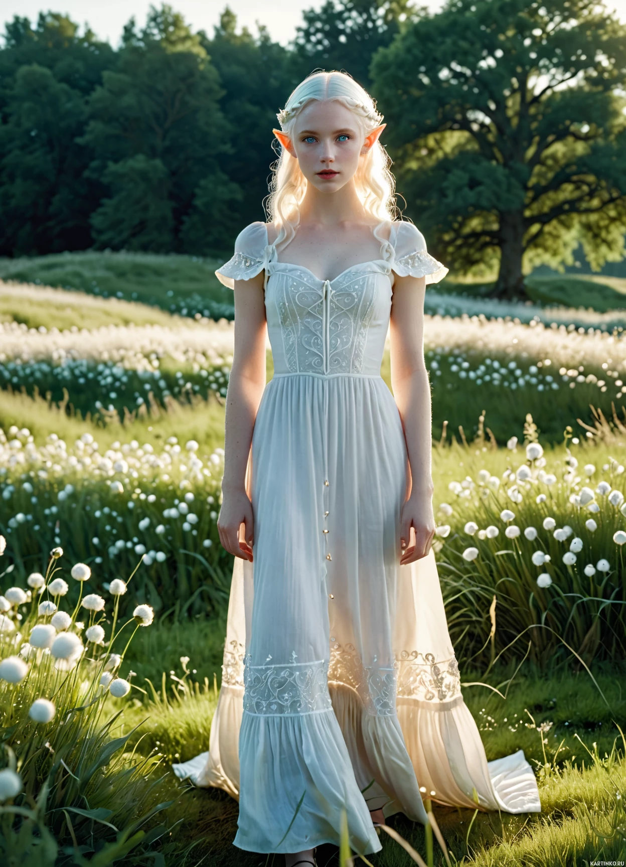 На картинке молодая женщина стоит посреди поля, усыпанного белыми цветами. У неё длинные волнистые светлые волосы и струящееся платье, доходящее до земли. На платье изящная шнуровка спереди и прозрачные рукава. Выражение её лица серьёзное, она смотрит вдаль. За её спиной — дерево с широкими ветвями, только начинающее распускаться. Земля под ногами влажная от недавнего дождя.