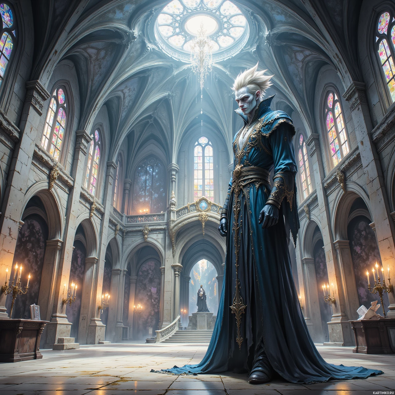 На картинке изображен персонаж в роскошных доспехах и одеянии, стоящий внутри богато украшенного готического собора. У него белые волосы и бледная кожа, а на лице – спокойное выражение. Высокие арки, ребристые своды и витражные окна придают зданию величие и масштабность.