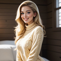 an indoor setting with wooden walls, contributing to a warm and cozy atmosphere. The woman appears to be posing for the photo, as she is looking directly at the camera with