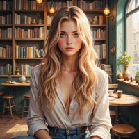 На картинке изображена молодая женщина с длинными светлыми волосами и светлой кожей, на фоне книжного магазина. Она сидит на табуретке, слегка наклонившись к зрителю, с подбородком, опирающимся на руку. Ее выражение лица нейтральное, но с любопытством. На ней светлая блузка с рукавами, засученными до локтей, и джинсы. На заднем плане видны полки, заставленные книгами разных размеров и цветов, и царит теплая, мягкая атмосфера, указывающая на дневное время суток в помещении.