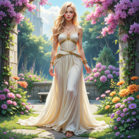 На картинке запечатлена девушка с светлыми волосами в профиль. На ней элегантное платье, ниспадающее до обнаженных ног. Платье украшено сложным узором на лифе и плечах. Вокруг шеи – нежное ожерелье. Она стоит на каменной дорожке, ведущей к скамейке на заднем плане. По обе стороны дорожки раскинулись пышные цветники, утопающие в розовых цветах. Место действия, похоже, спокойный сад или парк, освещенный мягким, вечерним светом.