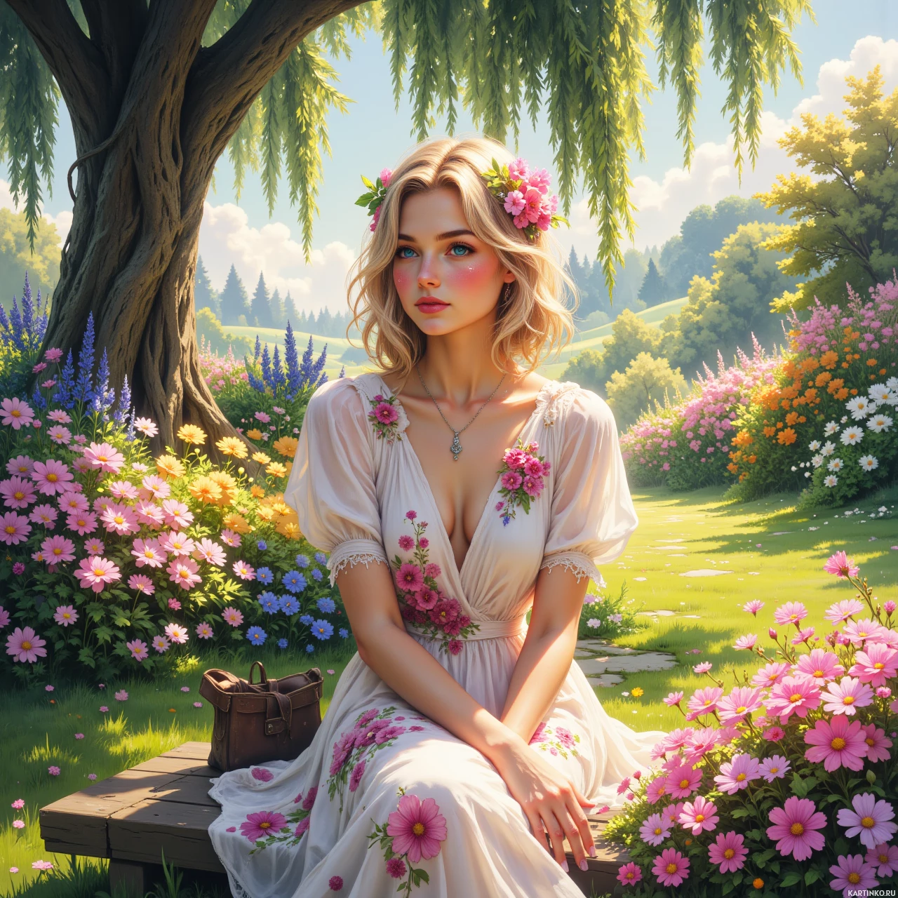 На картинке молодая женщина с золотистыми волосами, украшенными розовыми цветами, сидит на деревянной скамейке. На ней длинное белое платье с цветочным узором и пышными короткими рукавами, также украшенное розовыми цветами, перекликающимися с теми, что в её прическе. За скамейкой простирается зеленая лужайка с деревьями под нежно-голубым небесом, усыпанным облаками. Передний план заполнен разноцветными полевыми цветами, создающими идиллический пейзаж.
