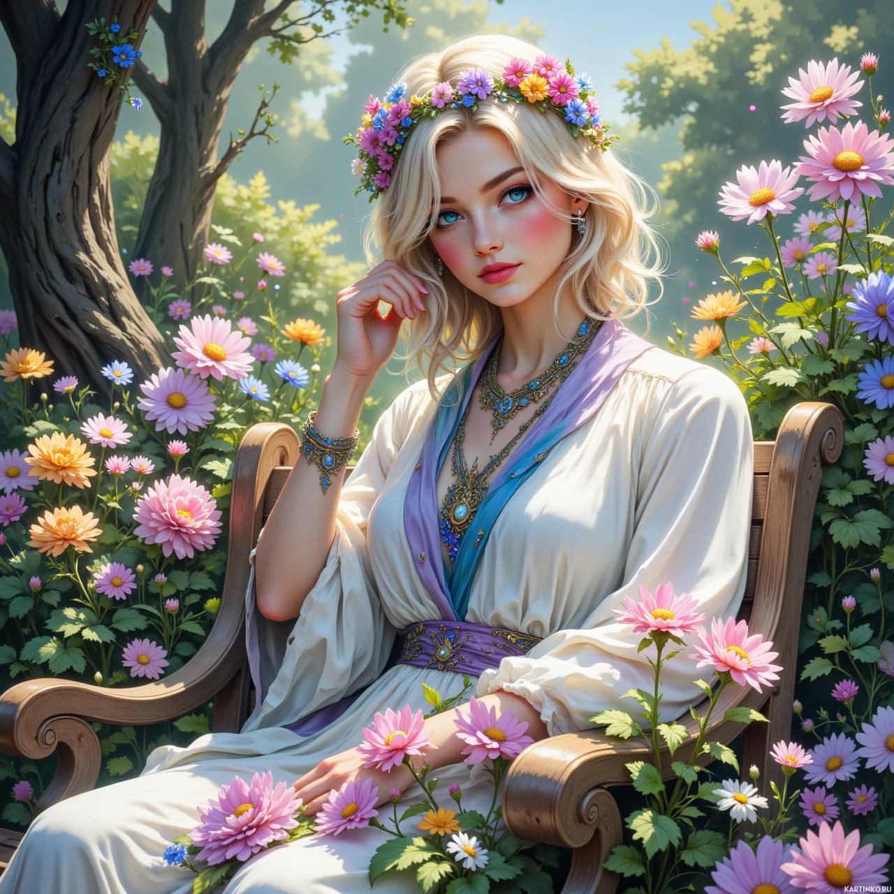 На картинке изображена девушка с белыми волосами и голубыми глазами, сидящая на каменной скамье, окруженной полевыми цветами. На её голове – венок из цветов, а на ней лёгкая, светлая накидка или шаль, украшенная вышивкой. Справа в кадре – яркие цветы, добавляющие яркости всему пейзажу. На заднем плане – пышная зелень и высокая трава, что указывает на то, что это открытая местность, возможно, сад или природная зона.