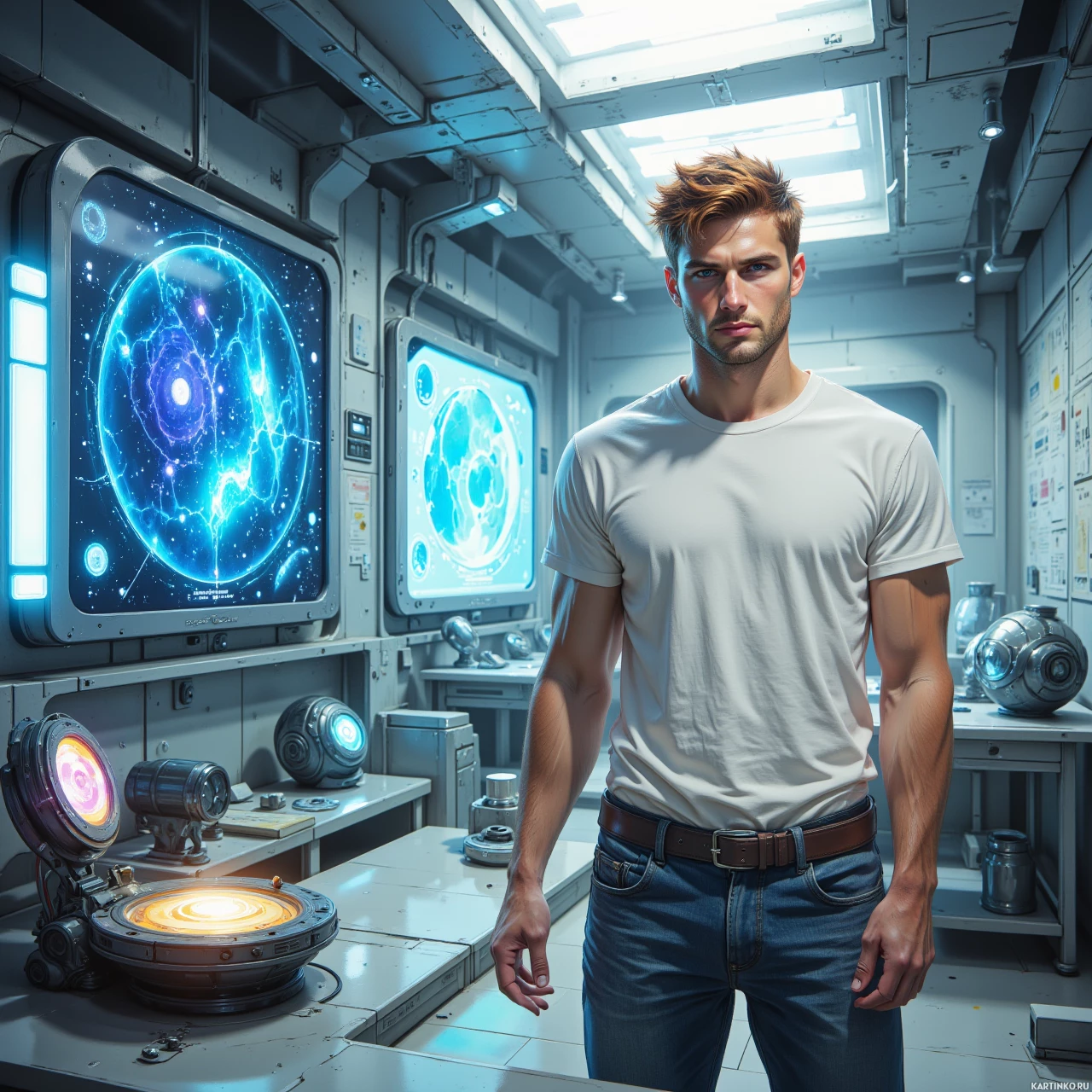 На картинке молодой человек стоит в помещении, похоже, футуристической лаборатории или рабочей зоне. Он расположен в центре кадра и занимает значительную его часть. У мужчины короткие тёмные волосы, он одет в простую белую футболку и синие джинсы. Его выражение лица серьёзное, и он смотрит прямо в камеру. Вокруг него – передовые технологии, свидетельствующие о научных исследованиях или экспериментах. На стенах висят мониторы с графиками и схемами, связанными с космосом или астрономией. На них – цифровой интерфейс с различными показателями и данными. Есть также стол с оборудованием и инструментами, что указывает на то, что это место, где проводятся работы, связанные с наукой или технологиями. Освещение в комнате искусственное, потолочные светильники заливают пространство, что создаёт футуристическую атмосферу. Стиль картинки предполагает сочетание реализма и, возможно, цифровой графики для стилизации.