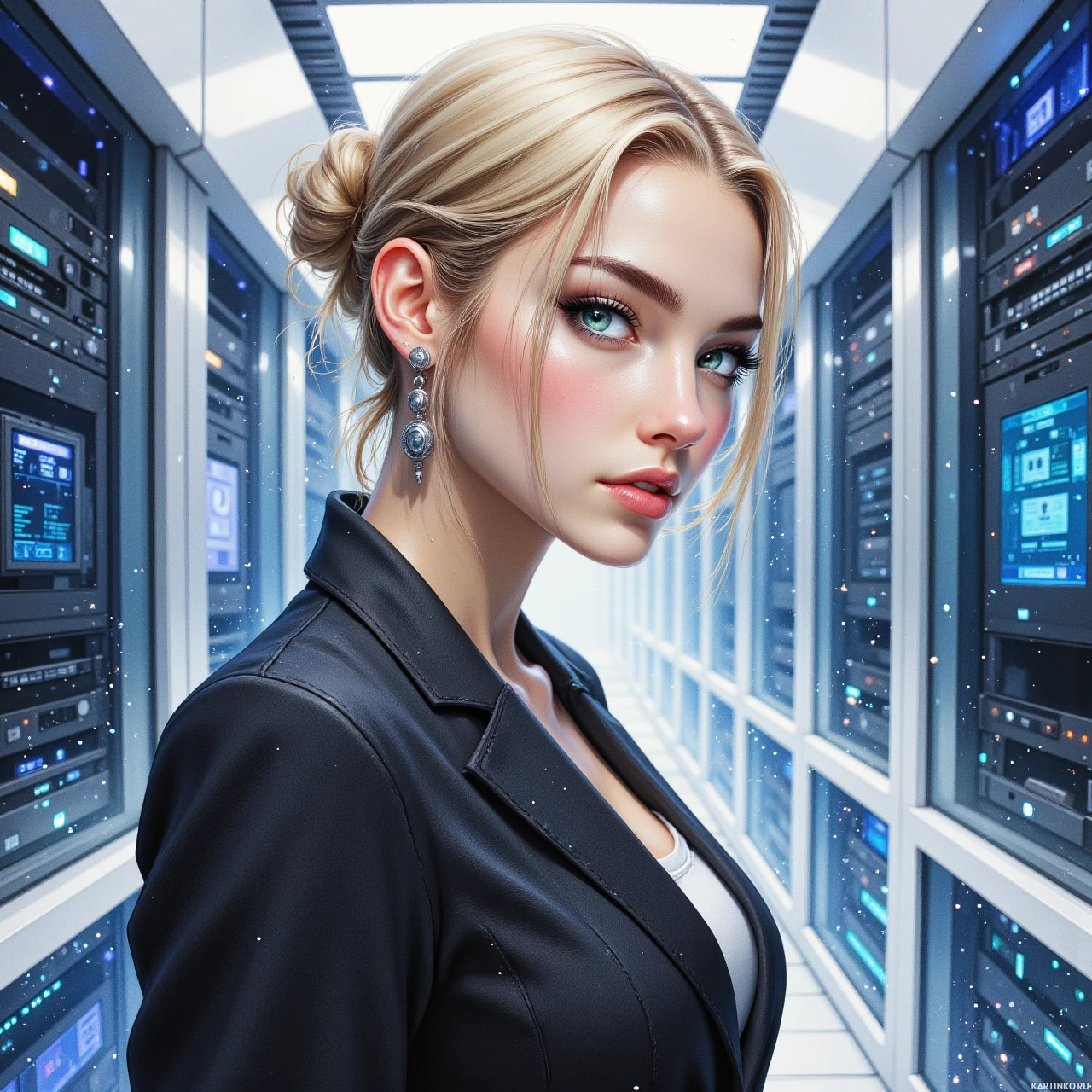 The image depicts a woman with blonde hair styled in an updo and wearing what appears to be a black jacket over a white top. Her makeup is done in a way that highlights her eyes, which are blue, and she has a neutral expression on her face. She is standing amidst rows of computer servers, which have glowing blue screens and wires running through them. The setting suggests a high-tech or futuristic environment.