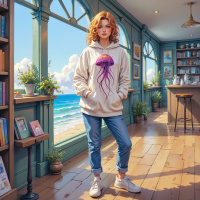 The image depicts a woman standing in an interior space that appears to be a cozy room, possibly a café or a bookshop given the presence of books and shelves. She is wearing a hooded sweatshirt with a graphic of a jellyfish on it. Her hair is blonde and she has fair skin. She is also wearing blue jeans and white sneakers. There are books on the shelves behind her, suggesting a literary theme to the room. The room has a nautical motif with decorations that evoke an ocean-side atmosphere.