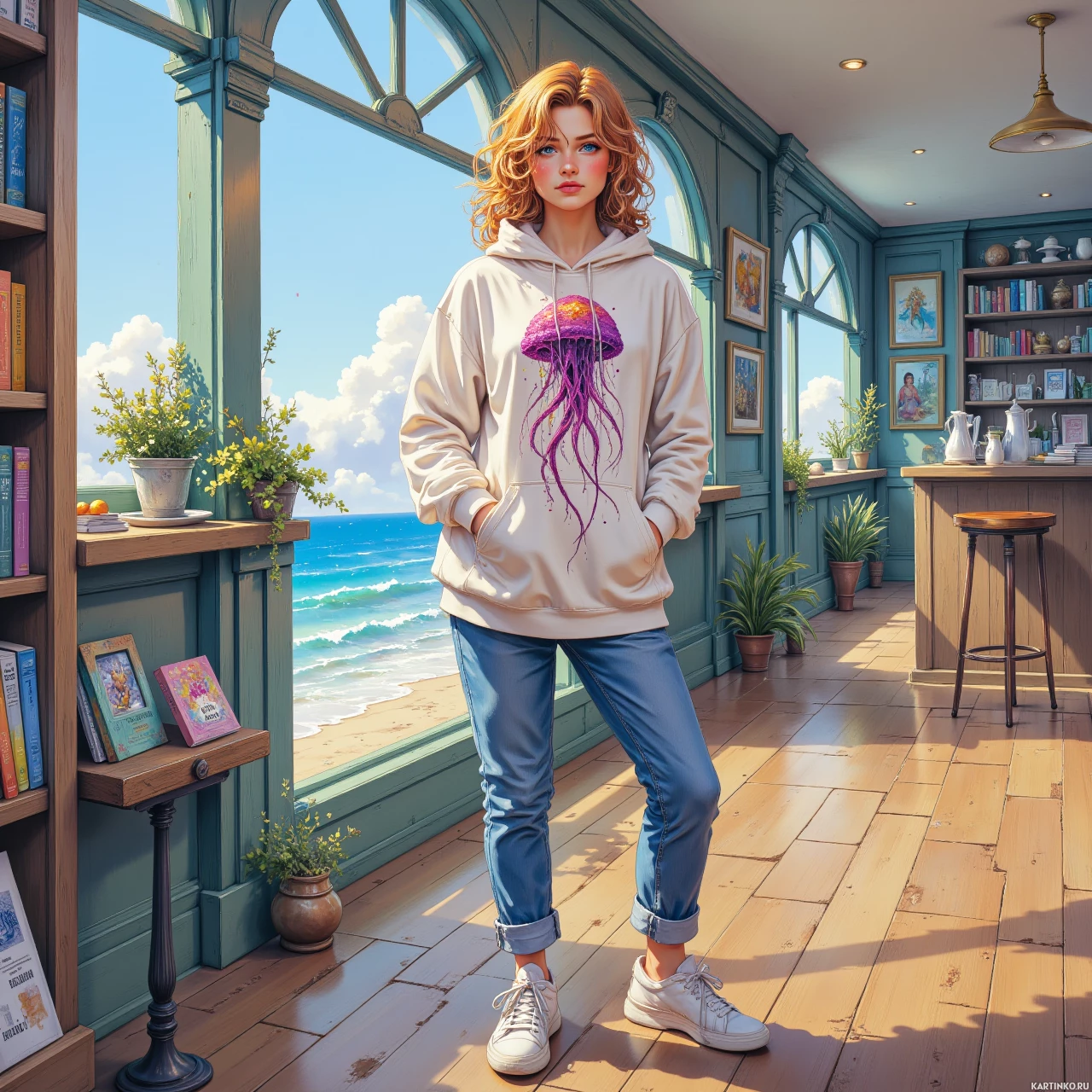На картинке изображена женщина, стоящая в уютном помещении, возможно, кафе или книжном магазине – об этом говорят книжные полки. На ней толстовка с капюшоном с изображением медузы, светлые волосы и фарфоровая кожа. Она одета в джинсы и белые кеды. Полки позади неё заставлены книгами, что создает литературную атмосферу. Комната оформлена в морском стиле с деталями, напоминающими прибрежный пейзаж.