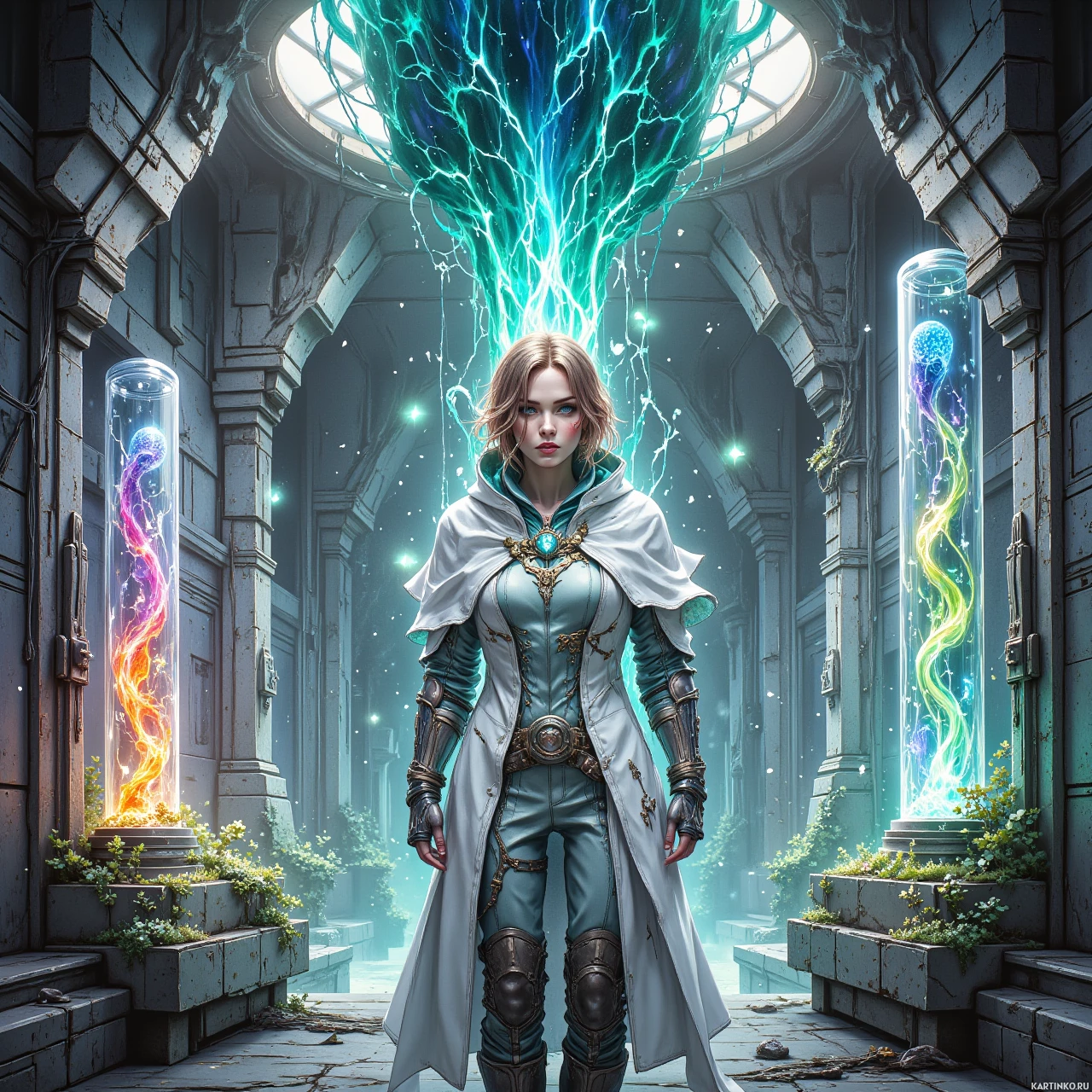 На картинке изображена девушка с светлыми волосами. На ней доспехи и плащ, что намекает на фэнтезийный или научно-фантастический сеттинг. Она стоит в центре того, что похоже на древний или мистический храм, как видно по архитектурным деталям вокруг неё. Сверху исходит светящееся свечение, что добавляет потустороннюю атмосферу сцене. Девушка смотрит на зрителя, позволяя рассмотреть её одежду и выражение лица.