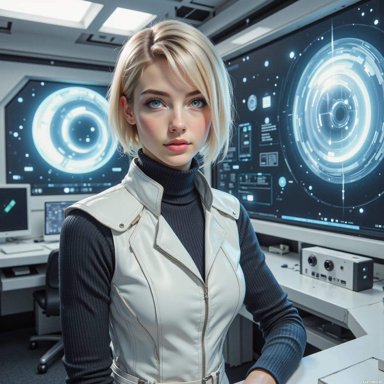 The image depicts a person with short blonde hair seated in front of a technological interface that resembles a control panel with digital displays and monitors. The individual is wearing a sleeveless jacket over a long-sleeved top, both predominantly white in color, with black accents. The person's expression is neutral, and they are looking directly at the camera. In the background, there are various screens displaying what appears to be computer readouts or data visualization.