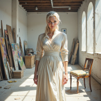 На картинке изображена женщина, стоящая внутри, вероятно, художественной мастерской или студии. У неё белые волосы и длинное кремовое платье с рукавами, подвёрнутыми до локтей. Вокруг неё - различные произведения искусства и материалы, что говорит о том, что это место используется для творческой деятельности.