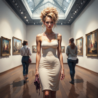 На картинке изображена женщина, стоящая в художественной галерее. У нее пышные светлые волосы, уложенные с объемом на макушке, и она одета в платье без рукавов с высоким воротником. Её осанка прямая, руки сложены на уровне талии, что создает впечатление выдержки или уверенности. На заднем плане висят картины, создающие ощущение закрытой экспозиции. В сцене присутствуют еще два человека: один сидит и стоит спиной к камере, другой стоит, не поворачиваясь к зрителю. Освещение в галерее говорит о дневном времени суток благодаря естественному свету из окон. Расположение женщины в кадре привлекает внимание к её наряду и манерам, контрастируя с более непринужденными позами окружающих. Особенно заметен её наряд благодаря элегантности, выделяющейся на фоне окружающей обстановки.