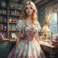 In this image, a young woman with long blonde hair is standing in an indoor setting that resembles a vintage room. She is wearing a white dress with floral patterns and a pink apron tied around her waist. Her expression is calm and she is looking directly at the viewer. The background includes wooden furniture, such as a desk and shelves filled with various items, giving the scene an antique feel.