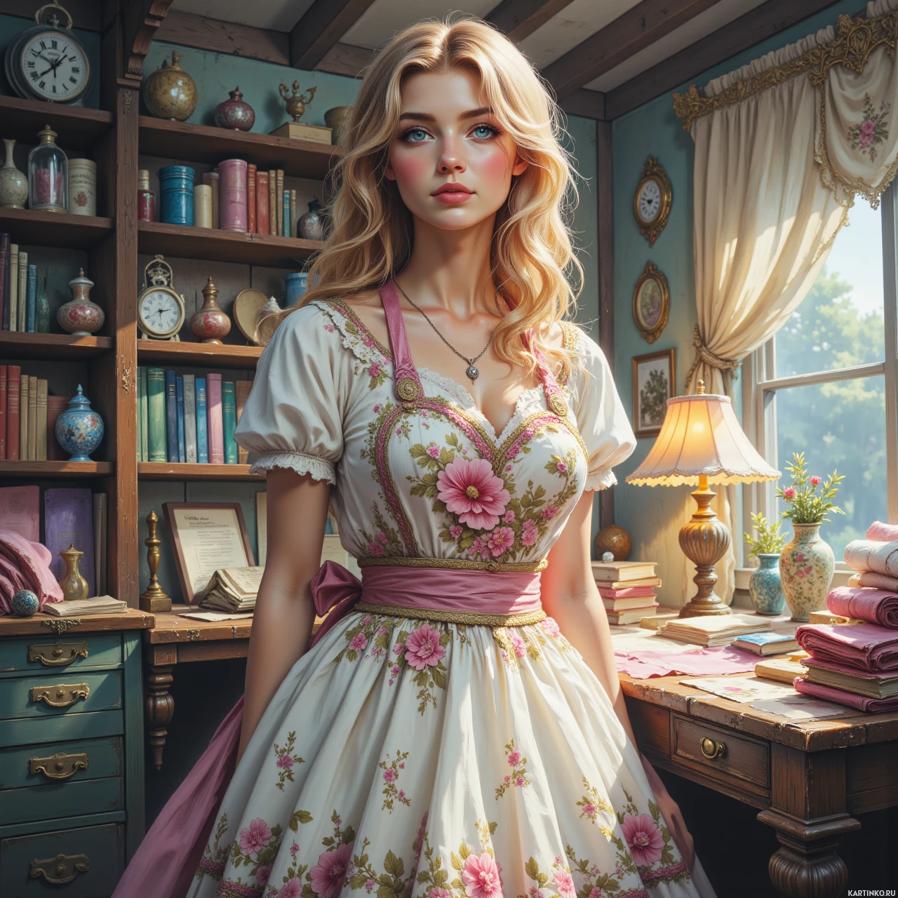На картинке молодая женщина с длинными светлыми волосами стоит в интерьере, напоминающем старинную комнату. На ней белое платье с цветочным принтом и розовый фартук, завязанный на талии. Её выражение лица спокойное, она смотрит прямо на зрителя. На заднем плане – деревянная мебель, например, стол и полки, заполненные разными вещами, что придает сцене ощущение старины.