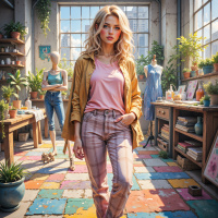 На картинке девочка с светлыми волосами входит в комнату в старинном стиле, переоборудованную в художественную мастерскую. Комната заполнена различными изделиями керамики и произведениями искусства, создающими атмосферу творчества. В комнате стоят два манекена по обе стороны; на обоих, кажется, надеты платья. Слева на картинке большое окно пропускает естественный свет. Девочка одета в повседневную одежду, включая клетчатую куртку, розовую рубашку и брюки в камуфляжном стиле.