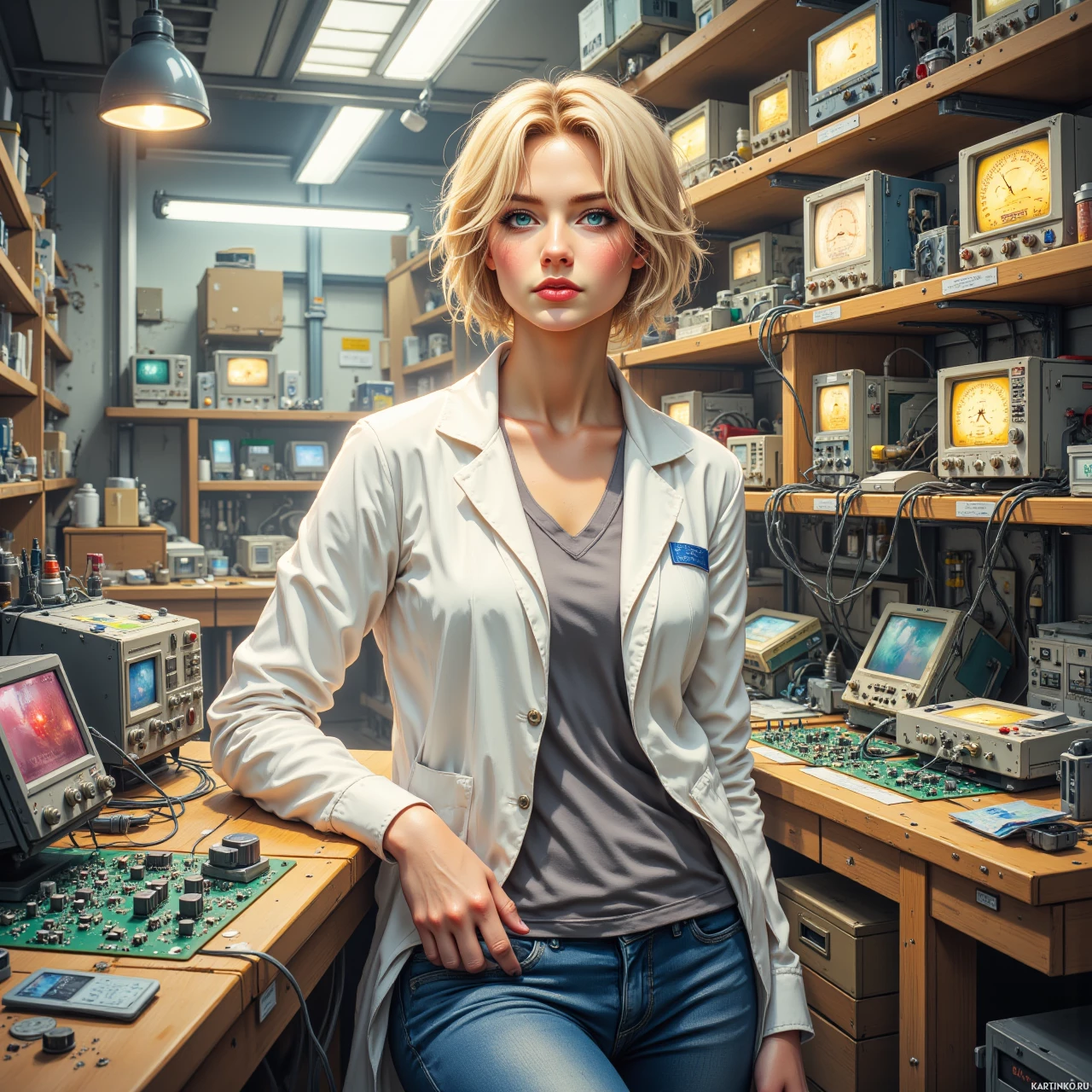 На картинке женщина с светлыми волосами в лабораторном халате сидит за столом, заваленным различным электронным оборудованием. Среди устройств – компьютерные мониторы, платы с микросхемами и другие компоненты. В руке у неё, похоже, синяя ручка. Судя по обстановке, она проводит эксперименты или исследования в электронной лаборатории.