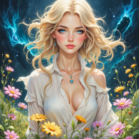 The image features a stylized female character with blonde hair and blue eyes. She has a fair complexion and is adorned with what appears to be gold or metallic earrings. Her expression is neutral, and she gazes directly at the viewer. Around her neck, there are what seem to be small blue gems or accessories. She wears a white garment that has lace-up detailing on the shoulder and appears to be semi-transparent in certain areas. The background is a blend of colors that resemble a night sky with stars and clouds, transitioning into what looks like a garden filled with flowers. The colors in the image are vibrant, with pinks, yellows, and purples being prominent. There are also elements that could be interpreted as fireflies or small glowing insects near her hair. The overall tone of the image suggests a fantasy or otherworldly theme.
