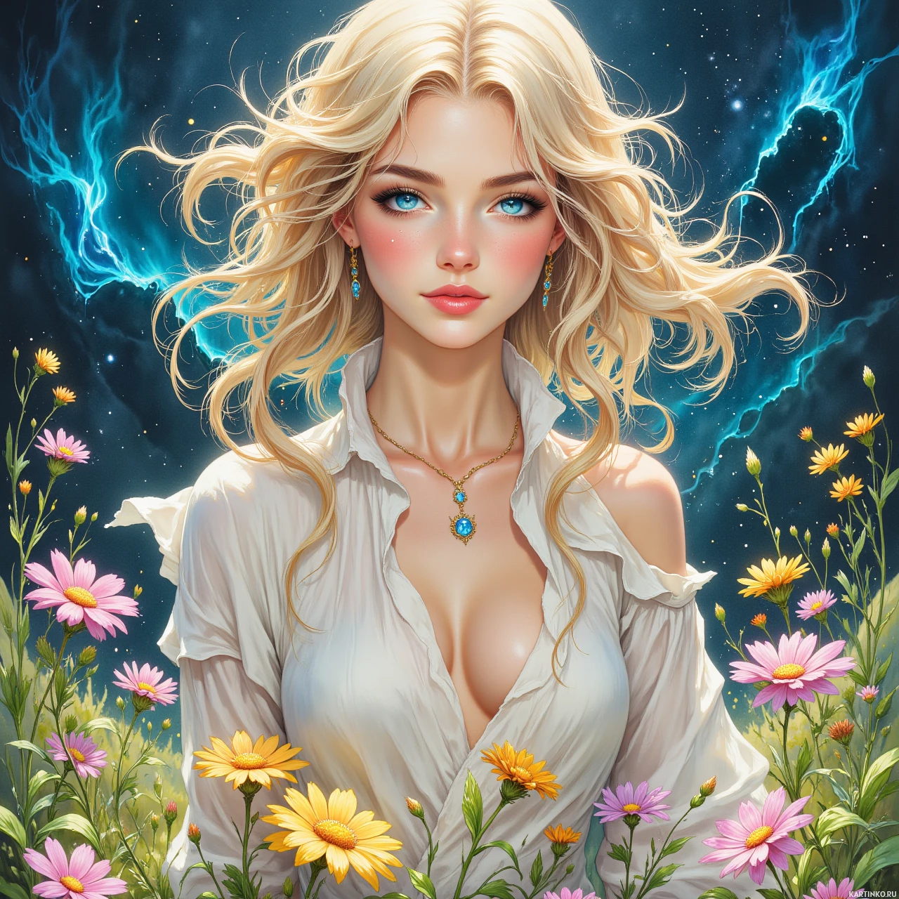 На картинке изображена стилизованная женская фигура с золотистыми волосами и голубыми глазами. У нее светлая кожа, а в ушах - украшения, похожие на золотые или металлические. Выражение лица нейтральное, и она смотрит прямо на зрителя. На шее заметны небольшие синие камни или аксессуары. На ней белое платье с декоративной шнуровкой на плече, которое кажется полупрозрачным в некоторых местах. Фон представляет собой сочетание цветов, напоминающее ночное небо со звездами и облаками, переходящее в сад, полный цветов. В картинке используются яркие цвета, преобладают розовые, желтые и фиолетовые оттенки. Рядом с волосами можно заметить элементы, которые можно интерпретировать как светлячки или маленькие светящиеся насекомые. Общее настроение картинки передает фантазийную или потустороннюю тематику.