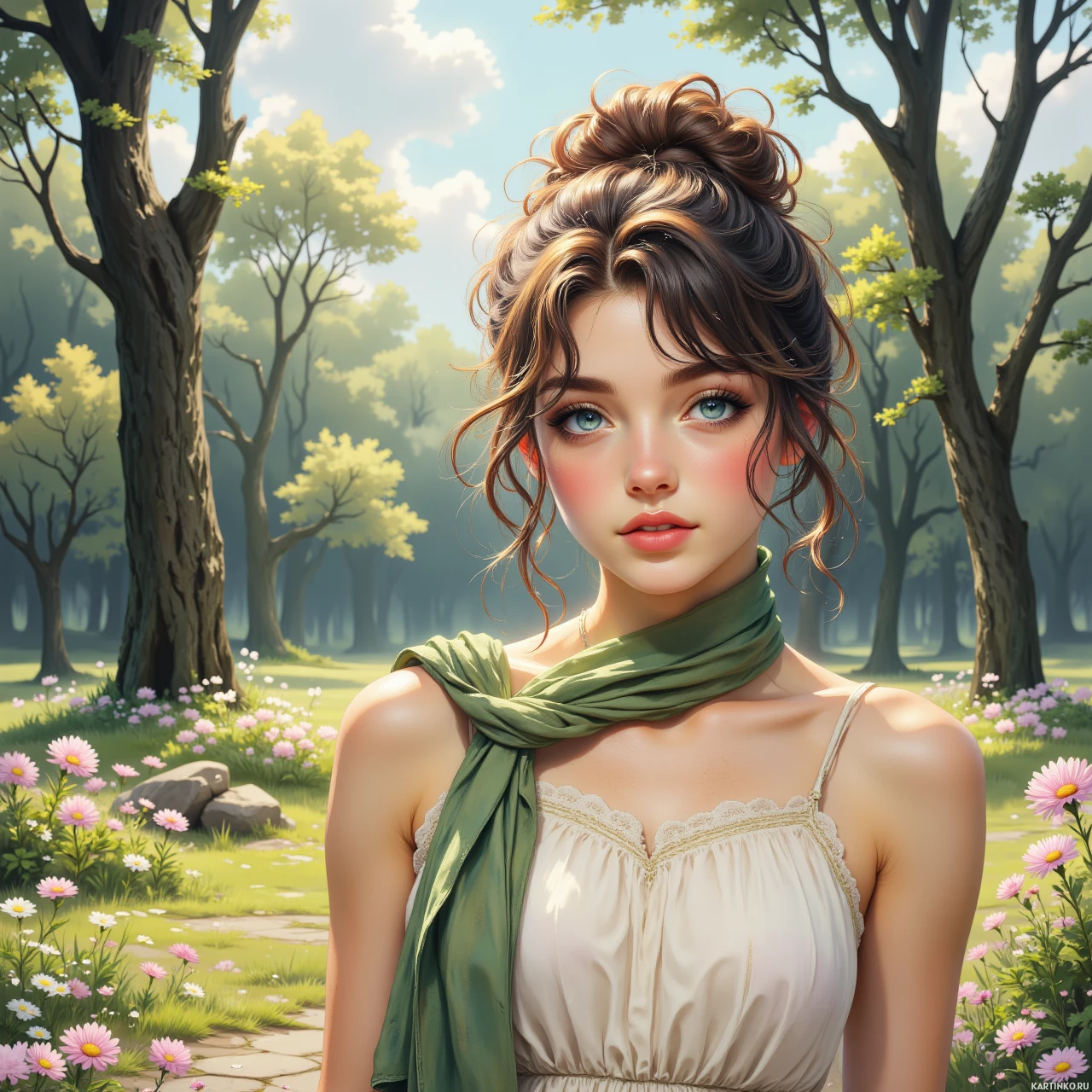 На картинке запечатлена молодая брюнетка с голубыми глазами, взгляд направлен в сторону, на лице – нежная улыбка. У неё румяные щёчки и лёгкий макияж, подчеркивающий черты лица. Волосы уложены в свободные локоны с объёмной челкой, обрамляющей лицо. На ней платье без рукавов с вырезом лодочкой и тонкими бретельками, что создаёт ощущение тёплой или весенней обстановки. Зелёный шарф небрежно накинут на плечи, и кажется, что она стоит на природе, окружённая пышными деревьями и полевыми цветами.