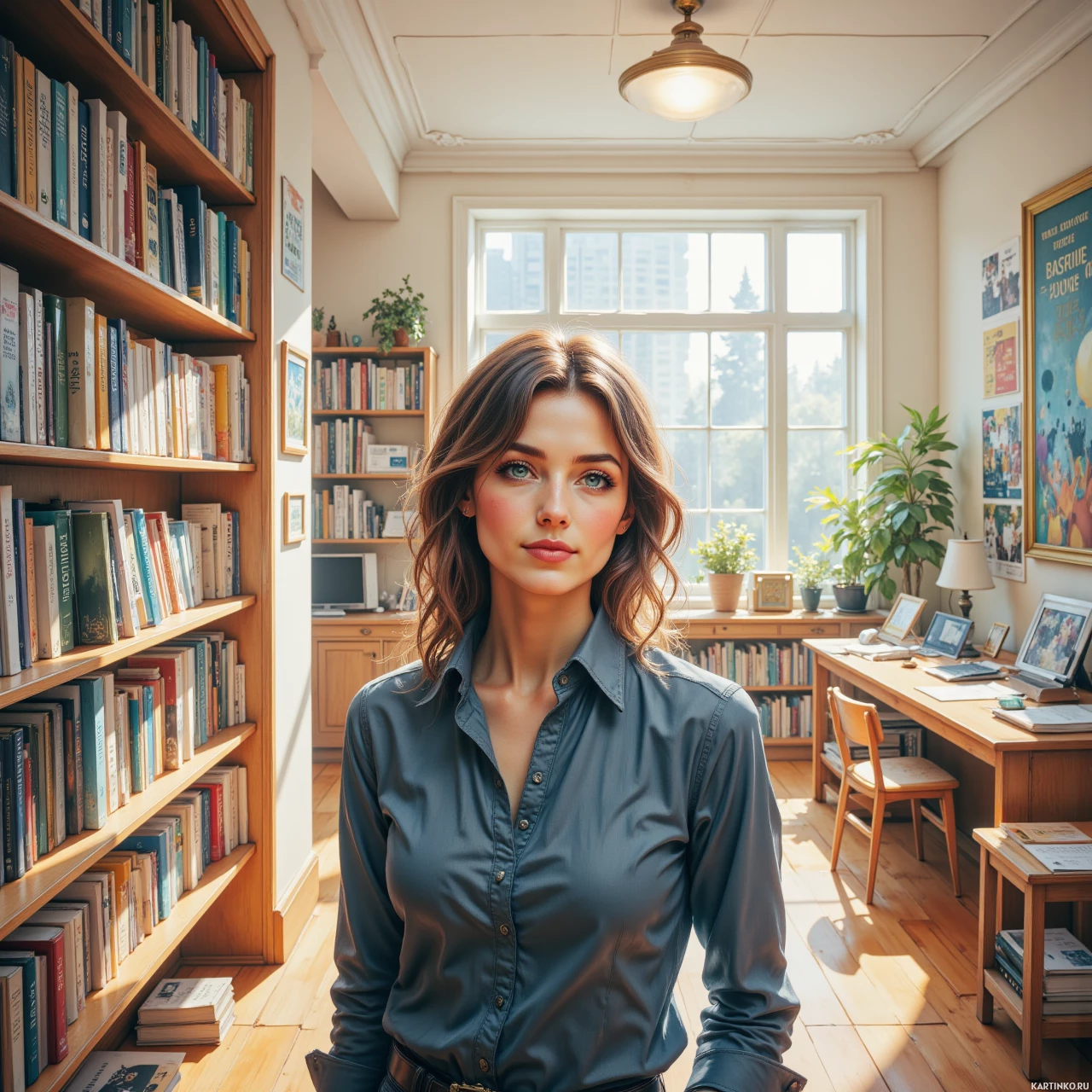 На картинке молодая женщина стоит в центре комнаты, полной книг. У неё руки на бёдрах, она смотрит прямо в камеру с лёгкой улыбкой. Комната залита ярким светом, что говорит о дневном времени суток. Полки, уставленные книгами разных размеров, выстроились вдоль стен. Несколько комнатных растений добавляют зелени в интерьер. Справа – стол со стулом, а слева – ещё одна книжная полка, доверху наполненная книгами. Общая атмосфера комнаты настраивает на тишину и спокойствие.