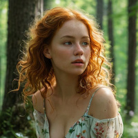 a forest setting. She is wearing a flowing,