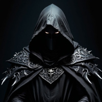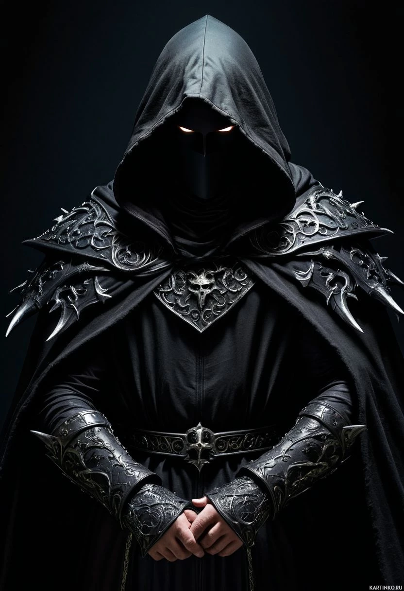 glowing eyes that seem to emit an eerie light. They are standing with their arms crossed over their chest, holding what looks like a staff or rod in one hand. The figure is adorned with various ornate accents on the cloak and the garments they are wearing, including what appears to be a chainmail-style bodice. The overall appearance suggests that this character could be from