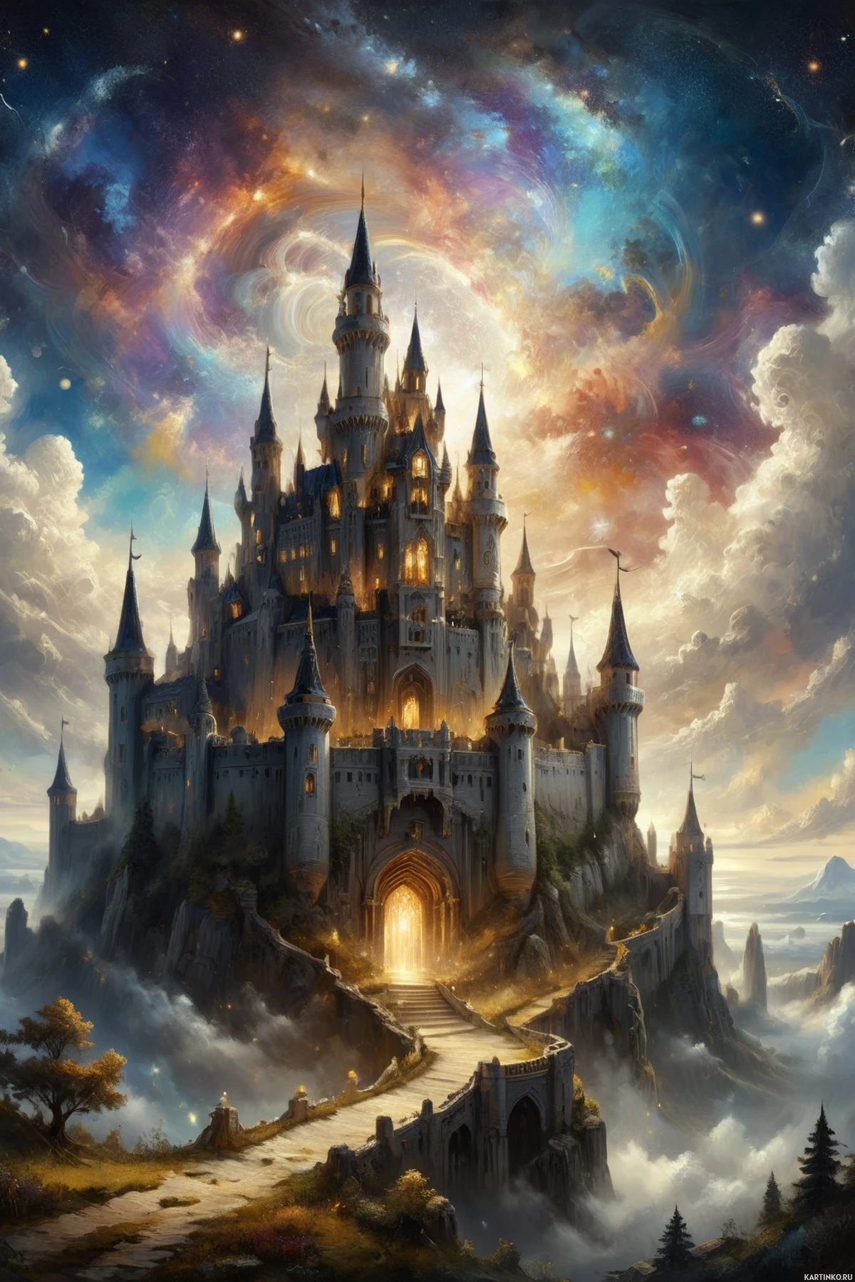 the fantastical realm inside. The sky is dramatic with clouds and stars twinkling in the distance, adding to