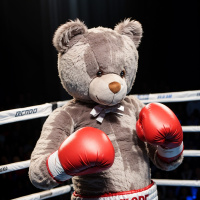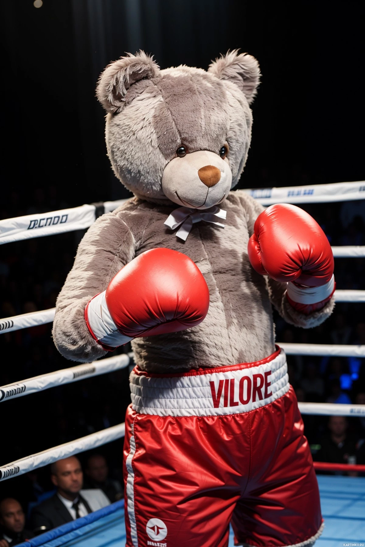 red shorts, white gloves, and appears to be punching with its right hand against the ropes of a blue boxing ring. The background suggests an indoor