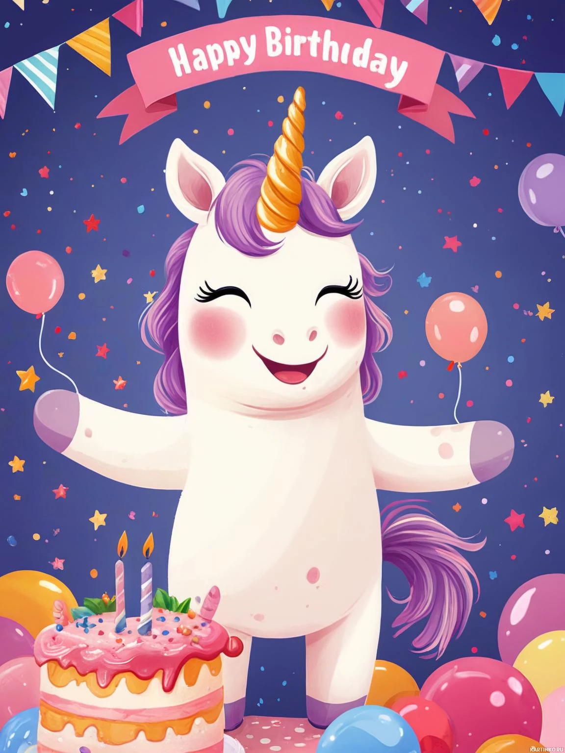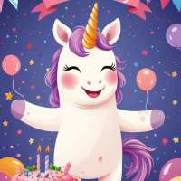 lit candles sits atop a table to the right of the unicorn. The overall scene is festive and joyful, evoking