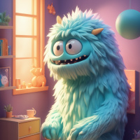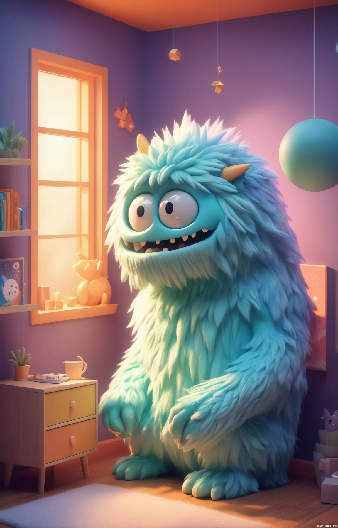 anthropomorphic monster with a fluffy white and blue appearance, sitting on a chair inside a room. It has