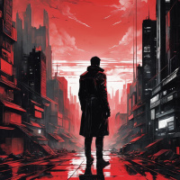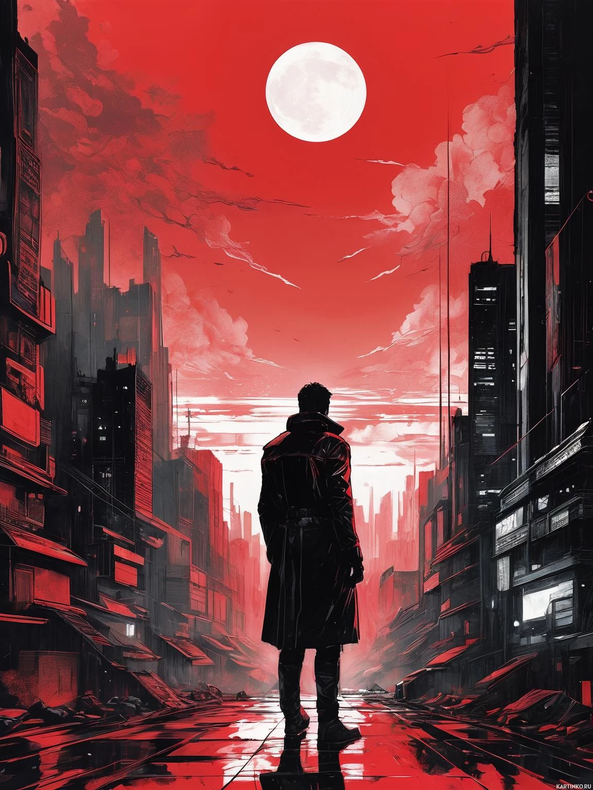 an urban landscape, which is bathed in a red, otherworldly glow. The city's architecture has