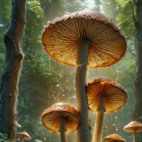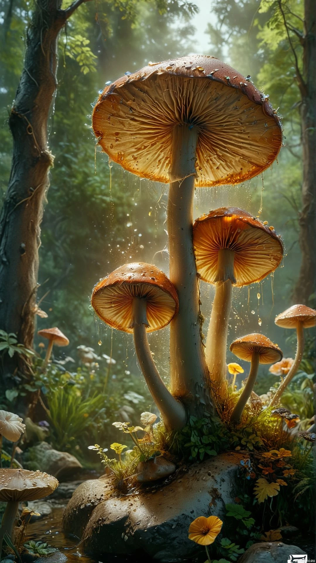 glowing mushrooms with intricate details and patterns that resemble traditional fairy tale illustrations. These mushrooms are surrounded by various other types of foliage, including broad-leafed plants and ferns, which contribute to