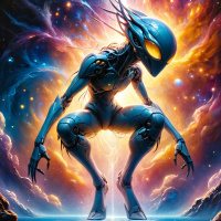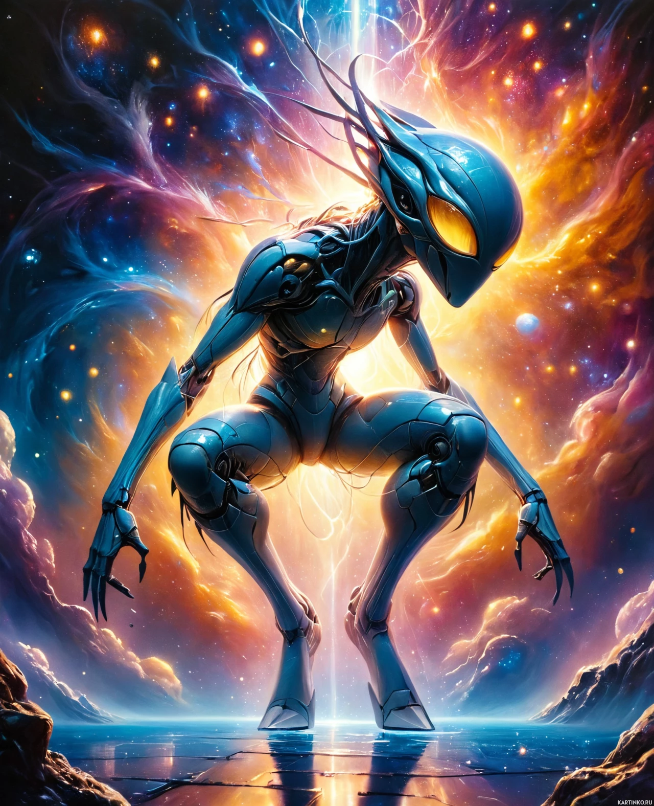 sharp eyes that suggest it may possess heightened senses. Its attire consists of flexible armor, which covers its torso, arms, and legs. The background of the image is surreal and vibrant, featuring