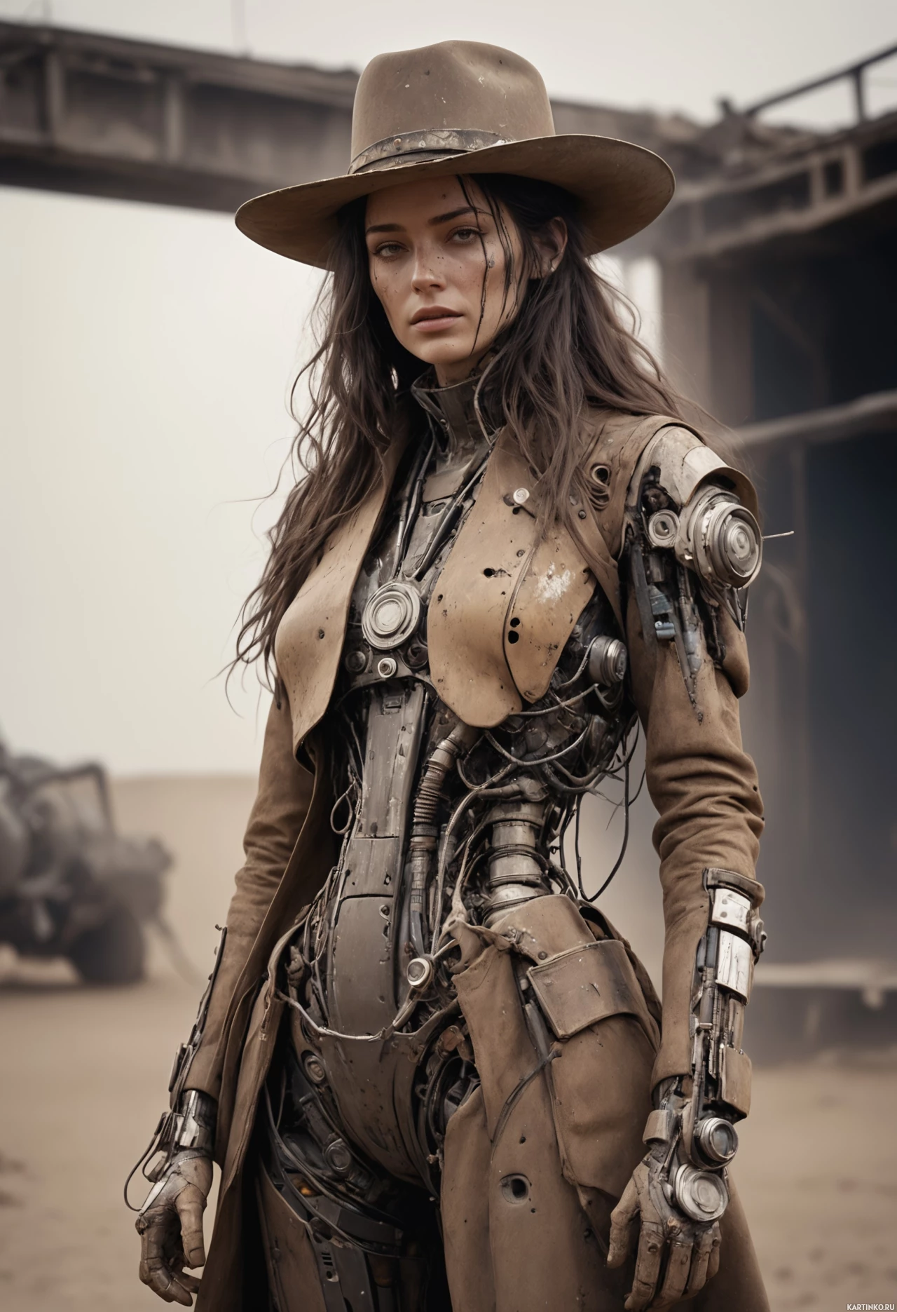 mechanical parts incorporated into her design. She stands confidently against an industrial backdrop that suggests a setting in a futuristic or