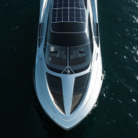 a modern yacht or speedboat that appears to be solar-powered. It is equipped with