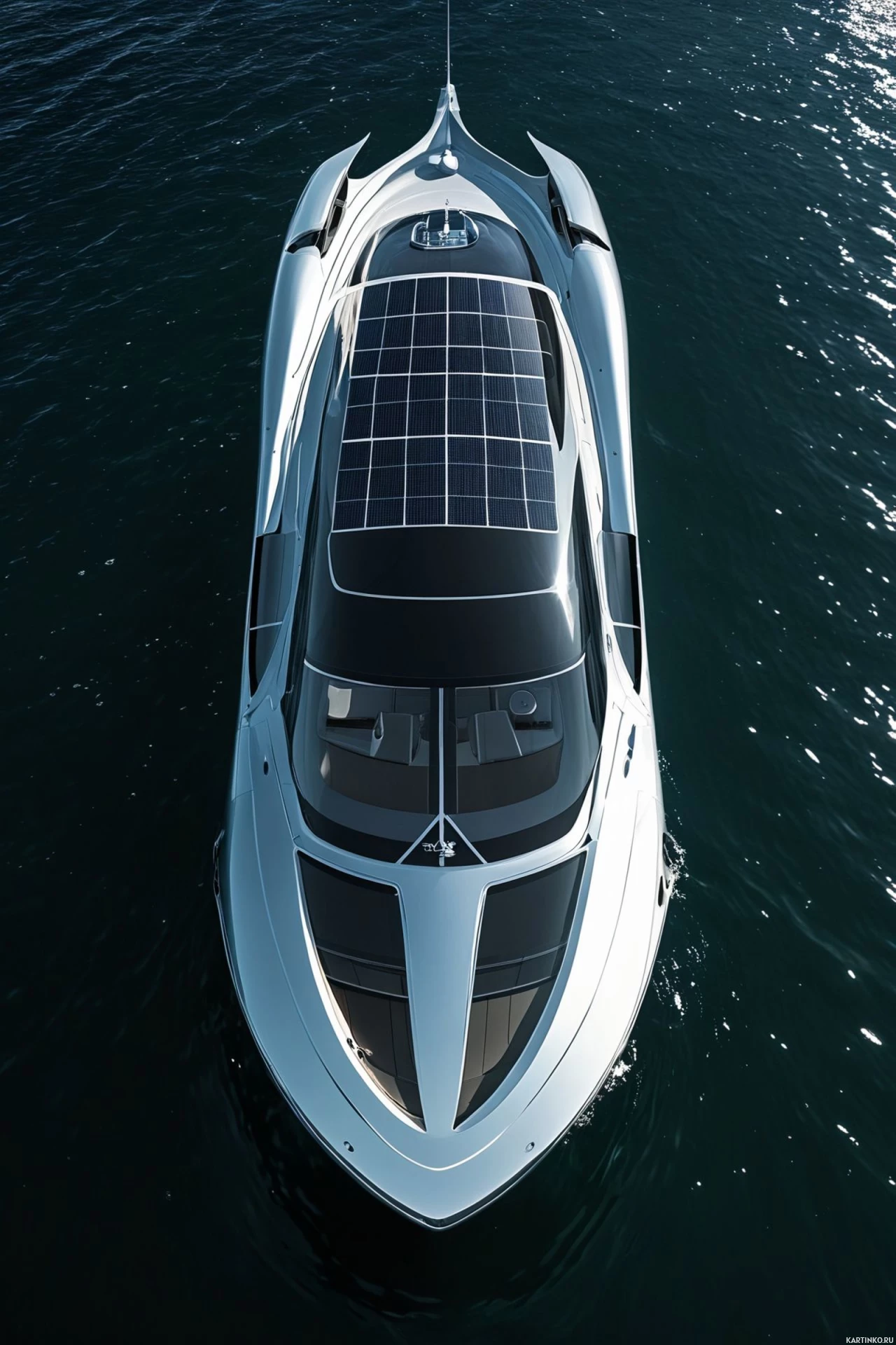 solar panels on the roof and deck, indicating it uses renewable energy for its operation. This vessel is designed for high-speed performance, as evidenced by its sleek lines and