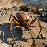 robotic vehicle designed to resemble a crab. It's equipped with tracks and is surrounded by construction materials like concrete blocks, sandbags, and what appears to be construction