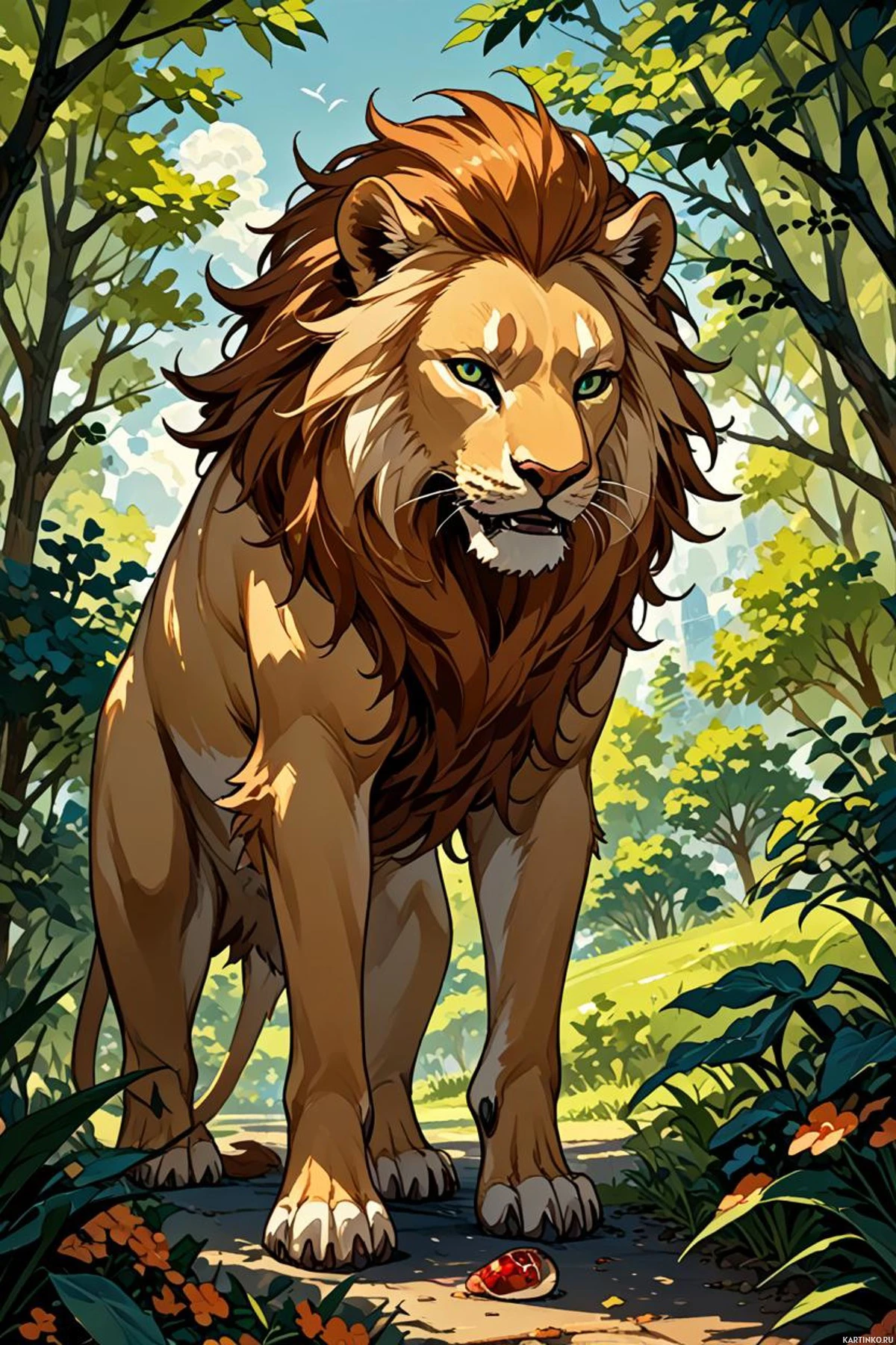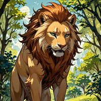 a forest setting. The lion is depicted with a stunning, detailed mane and a strong