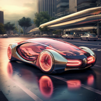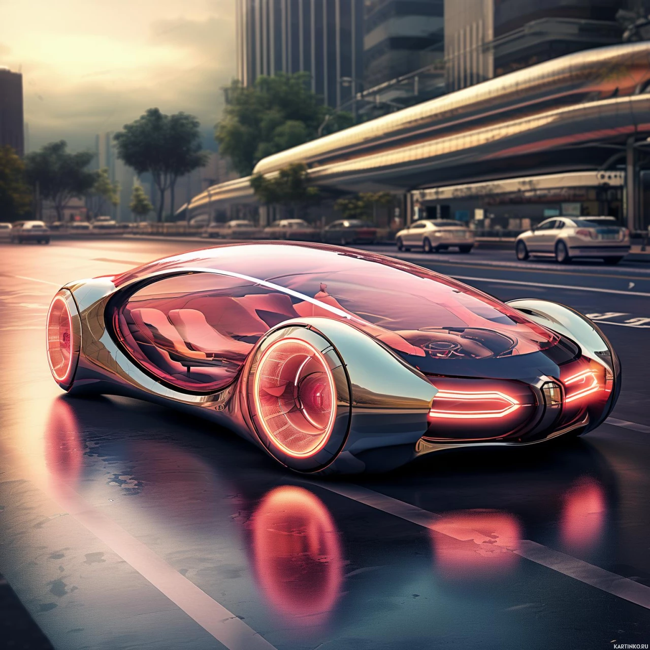 The image shows a futuristic car with a transparent body and