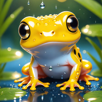 nighttime setting with droplets of water falling from the sky, creating a reflective surface on which the frog sits. The style of the image suggests it could be used for