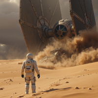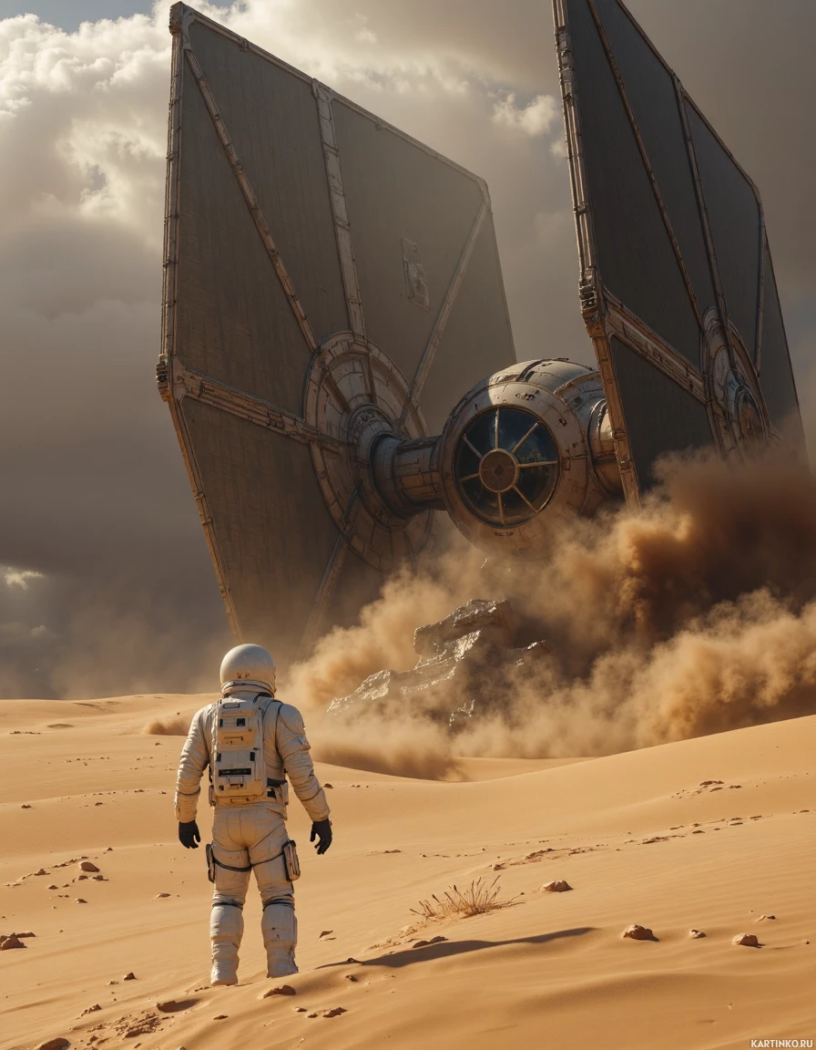 a desert landscape with sand dunes stretching out as far as the eye can see. The sky above is cloudy and gray, suggesting a stormy weather condition. Overall, the image presents a dramatic and otherworldly scene, evoking a sense of adventure and exploration in an alien environment.