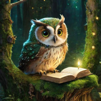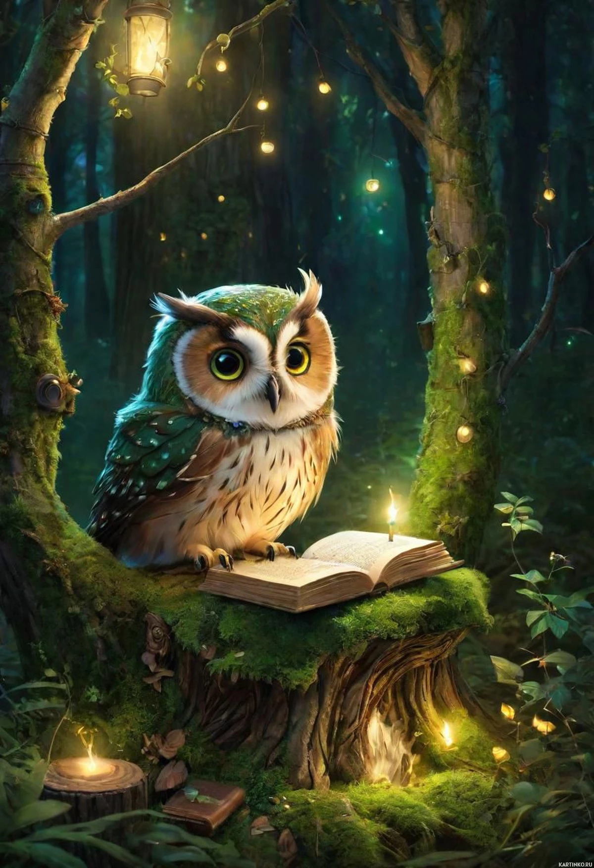 a whimsical scene featuring an owl perched on a book, which is open and placed on a small stump. The owl, with its large