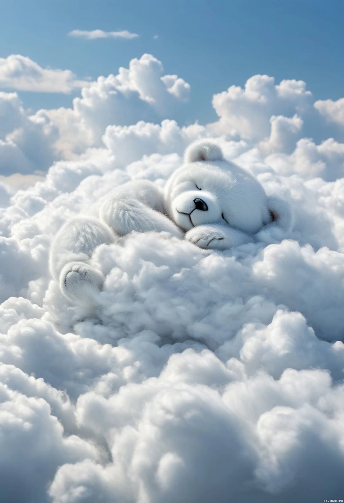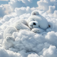 a baby bear resting peacefully on a soft, white cloud. The cloud is fluffy and looks comfortable, providing a gentle surface for
