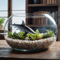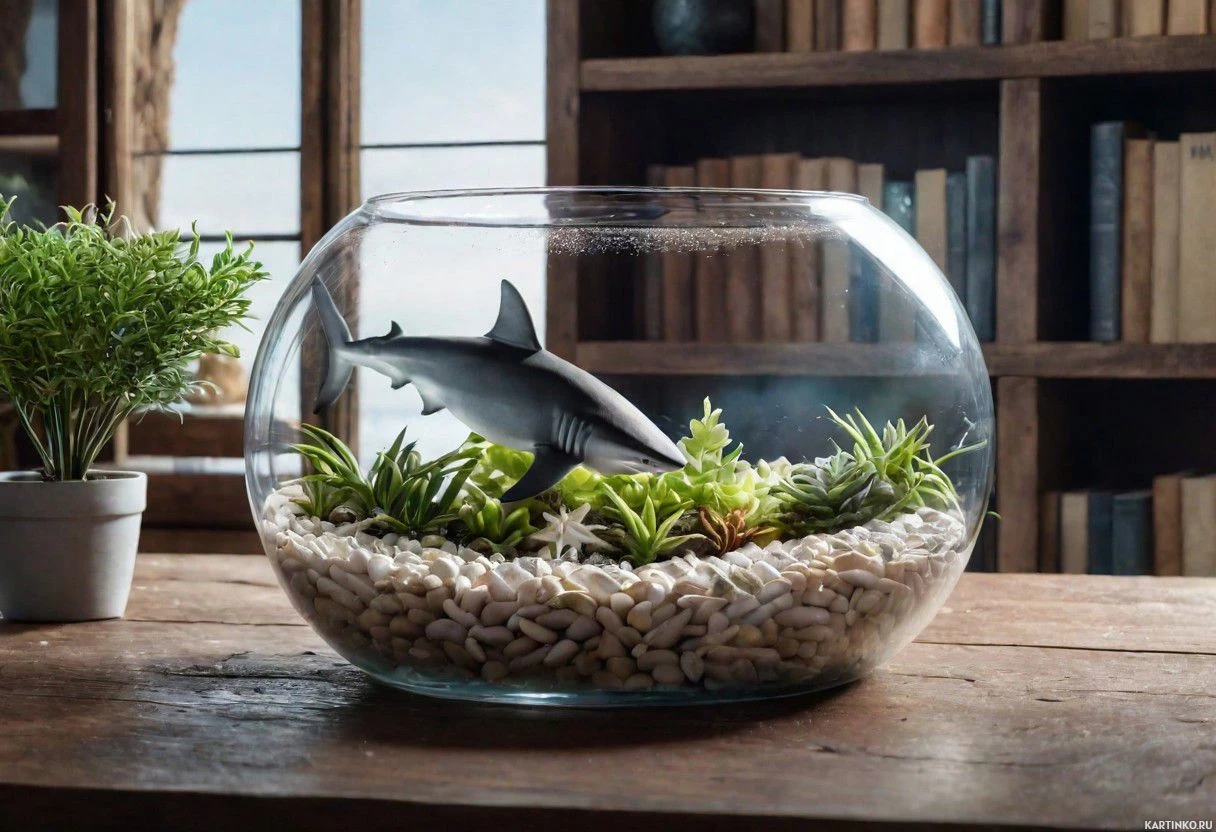 an indoor setting with a decorative, spherical aquarium that contains a sandy substrate and various plants, including what appears to be succulents. Inside the aquarium is a model shark, which adds a playful element to the display. The aquarium is placed on