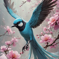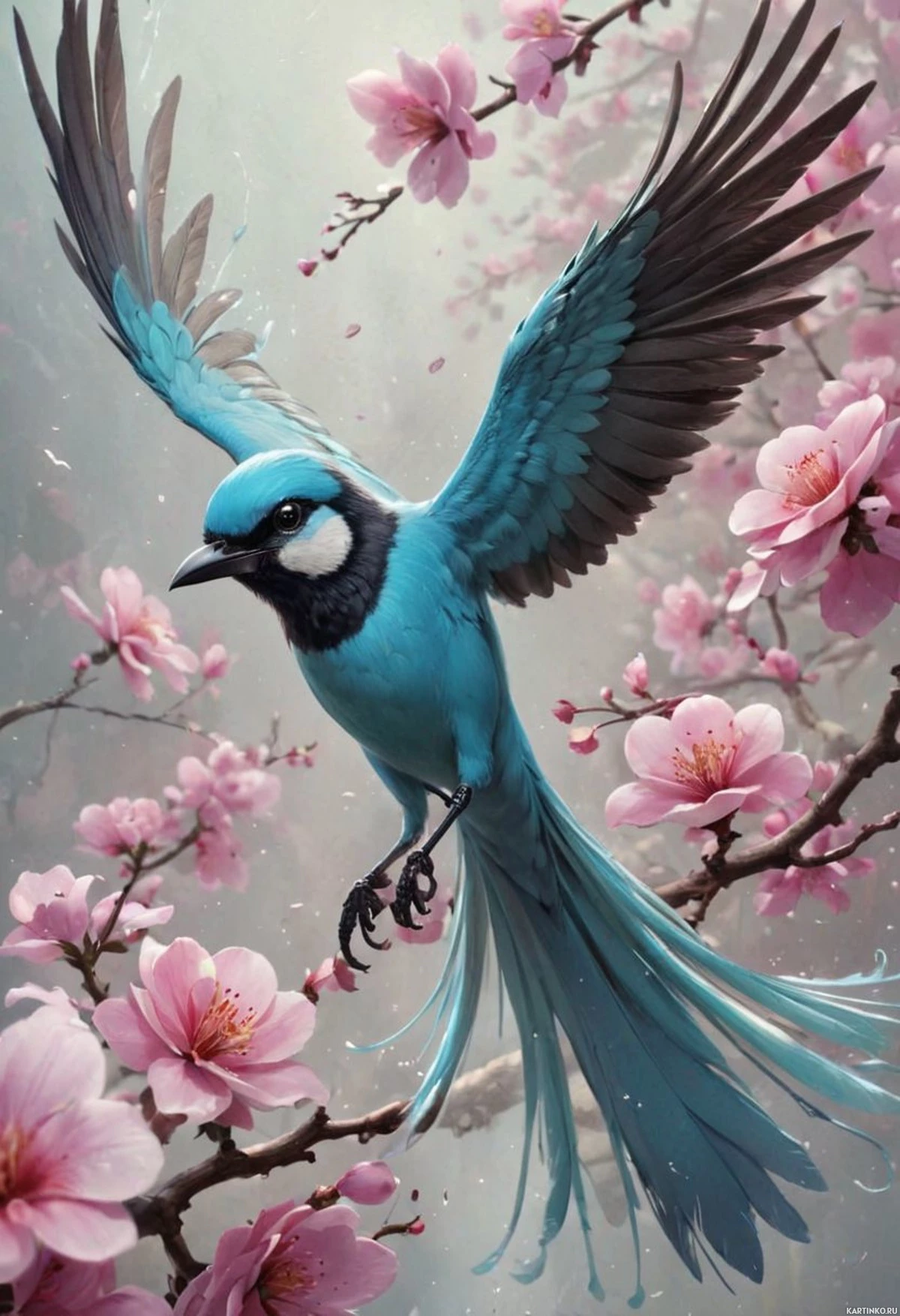 pink flowers around it. The bird has bright blue plumage with some