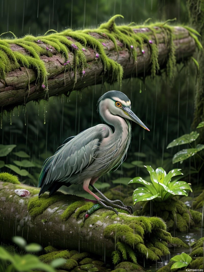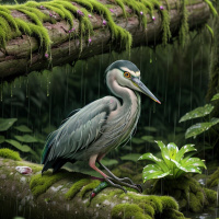 a natural setting with moss and ferns. The background suggests a forest or wetland environment, with