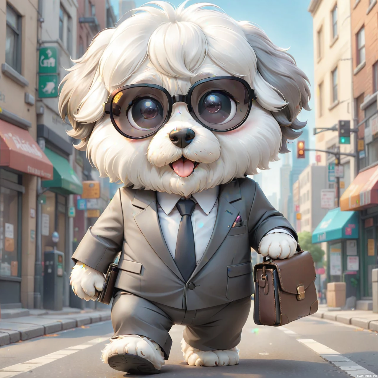 animated character that resembles a Shiba Inu dog. This character is anthropomorphized, wearing a suit with a tie and sunglasses, and carrying a briefcase in its paws while walking down a street with shops on either side. The character's expression is happy and confident, as it looks towards the camera. The scene suggests a lively