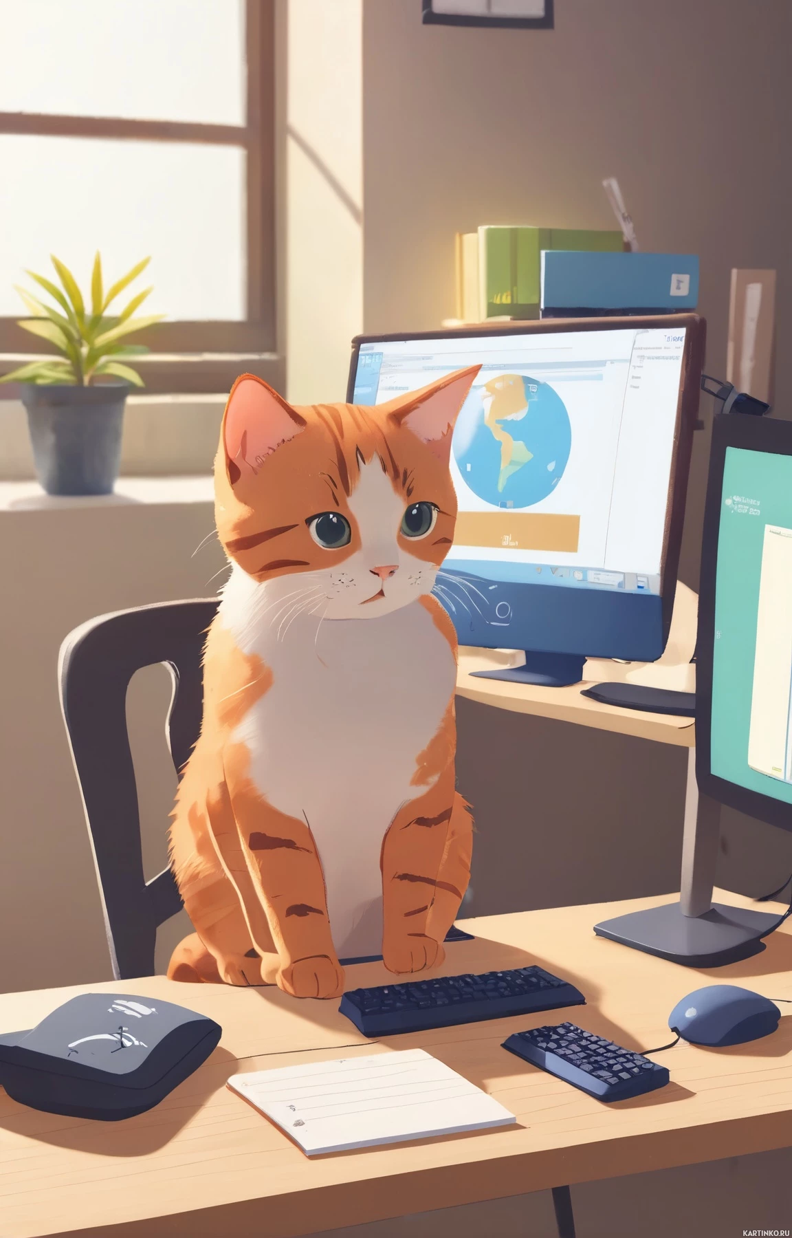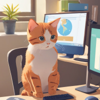 a computer monitor displaying a world map with various locations marked, suggesting that the cat might be working on some sort of global project or researching information. To the right of the cat, there's
