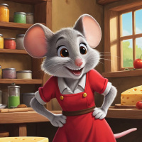 mouse character standing in front of a wooden counter with various jars and bottles, suggesting it could be a setting for food preparation or display. The mouse has gray fur and is wearing