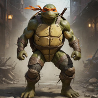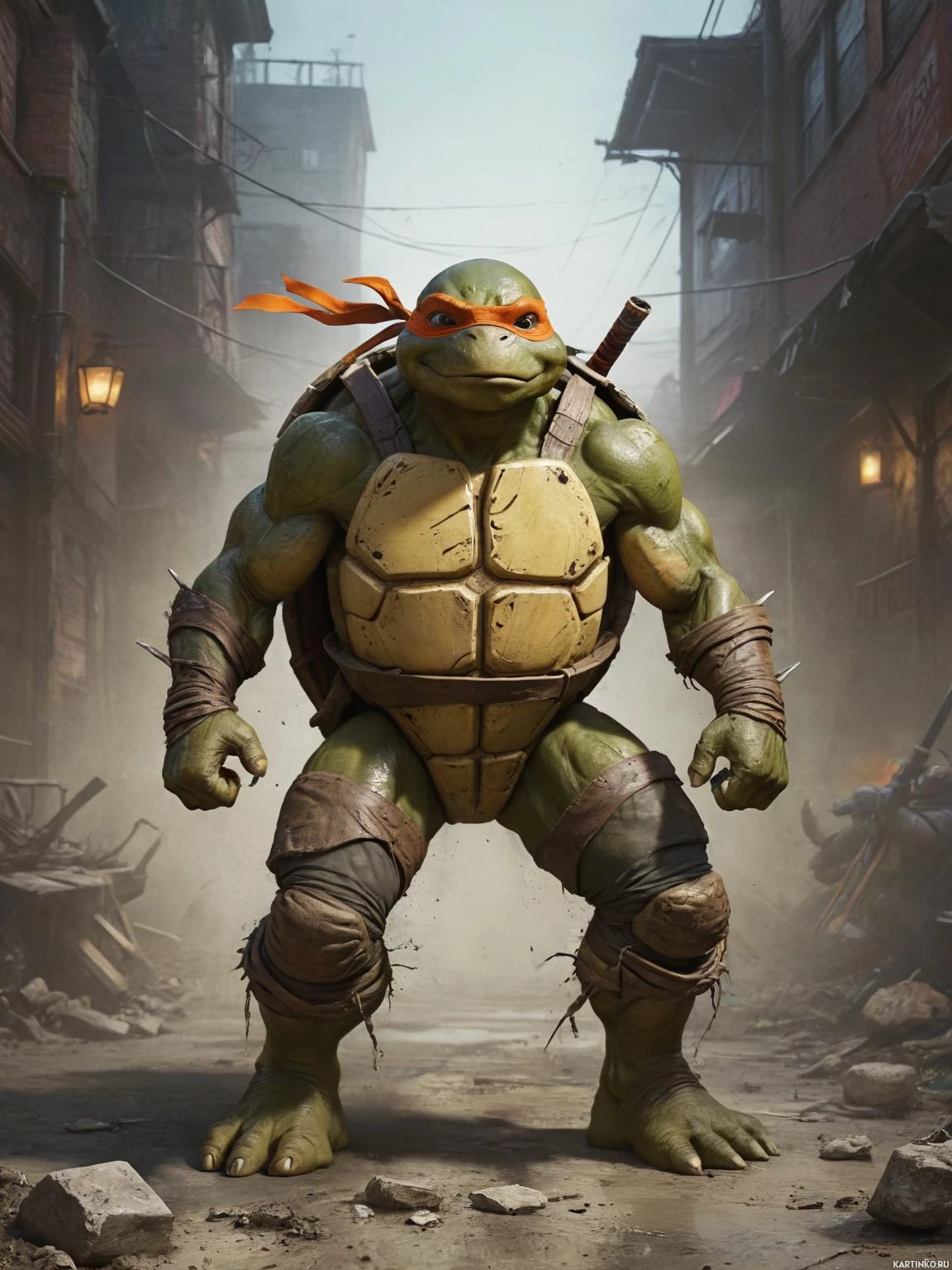 an animated character resembling Donatello from the Teenage Mutant Ninja Turtles franchise. He is standing in a street setting that appears to be a dilapidated urban area, possibly inspired by scenes from