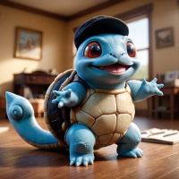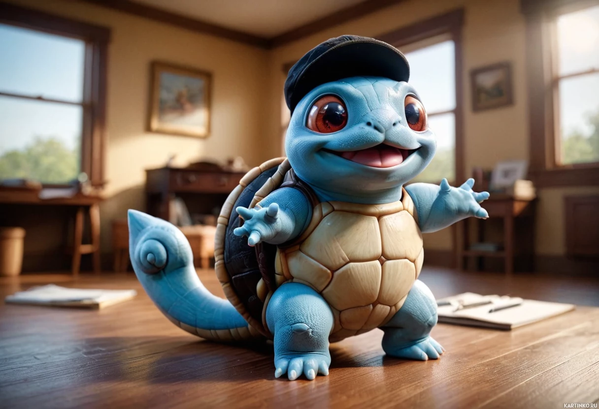 a wooden floor, looking surprised or excited with its arms spread wide and mouth open as if it's about to say something. Pikachu is wearing a baseball cap backwards and has its characteristic